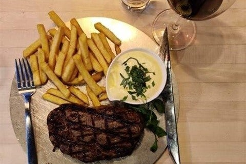 Vi ventede forholdsvis længe på at få udleveret menukort og mulighed for at bestille drikkevarer, men det var absolut ventetiden værd: perfekt stegt ribeye og bearnaise næsten som Fru Hahn senior ville ha lavet den.